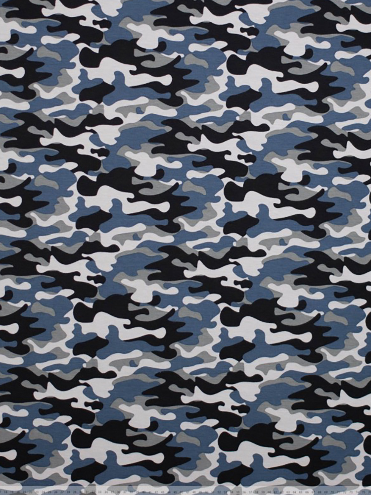 Hochwertiger, elastischer Jersey aus Baumwolle. Wegen des hohen Elasthananteils sehr formbeständig und bequem zu tragen. Bedruckt ist dieser Jersey mit einem Tarnmuster in Blautönen (passt super zu Jeans!) . Öko-Tex Standard 100, ca. 200 g/m²