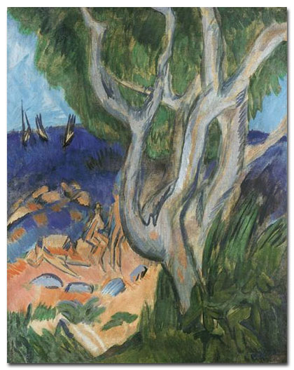 1915 trat Ernst Ludwig Kirchner den Kriegsdienst an, schied aber nach wenigen Monaten wegen eines Nervenzusammenbruches wieder aus. Zwei Jahre verbrachte er in einem Sanatorium im Taunus und zog dann um nach Davos, wo er zunächst alte Bilder übermalte und vordatierte, "um seine kunsthistorische Position anders zu akzentuieren". Grossartige Bilder, geprägt durch die Schweizer Bergwelt, verschafften ihm endlich den ersehnten Erfolg. 1931 wurde er Mitglied der Preussischen Akademie der Künste in Berlin. 1937 diffamierten die Nationalsozialisten Kirchner als "entarteten Künstler" und beschlagnahmten 639 seiner Werke aus deutschen Museen. Seinen lang gehegten Wunsch noch einmal nach Fehmarn zurückzukehren konnte er nicht mehr verwirklichen: Am 15. Juni 1938 wählte Ernst Ludwig Kirchner, von Krankheiten angegriffen und verzweifelt, in Frauenkirch-Wildboden bei Davos den Freitod. |