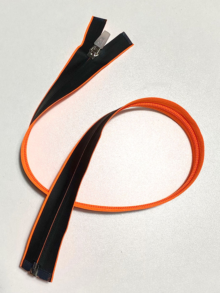 Wasserabweisender, teilbarer Reißverschluss mit weicher 6mm Spirale. Der Reißverschluss ist neonorange, die schwarze Beschichtung an der Außenseite macht den Reißverschluss dauerhaft wasser- und schmutzabweisend. Der Schieber mit Griff aus Gummi arretiert nach dem Herunterklappen, baumelt also nicht störend herum. Der Reißverschluss lässt sich bei Bedarf am oberen Ende einfach selbst kürzen.