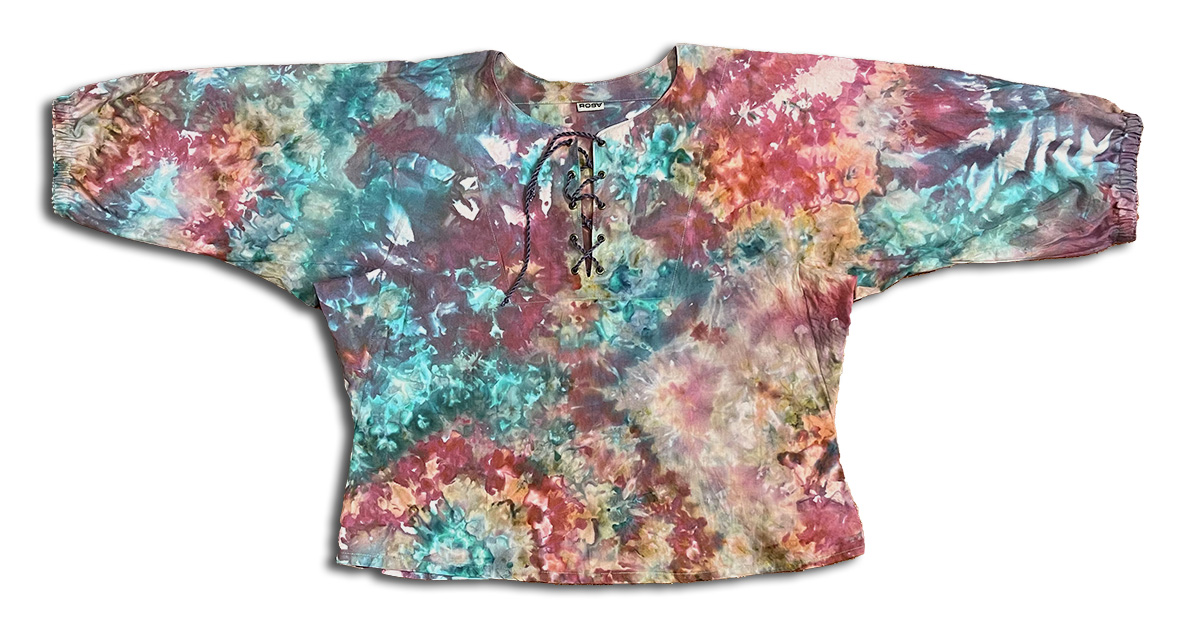 Dieses Hemd im Boho Stil haben wir aus einfachem, weißem Baumwollstoff genäht und für diese Anleitung trocken mit Eis gebatikt.Ganz unten auf dieser Seite gibt es ein Video, hier zeigen wir aber nun erst einmal mit Bildern, wie und womit wir unser Hemd gebatikt haben.